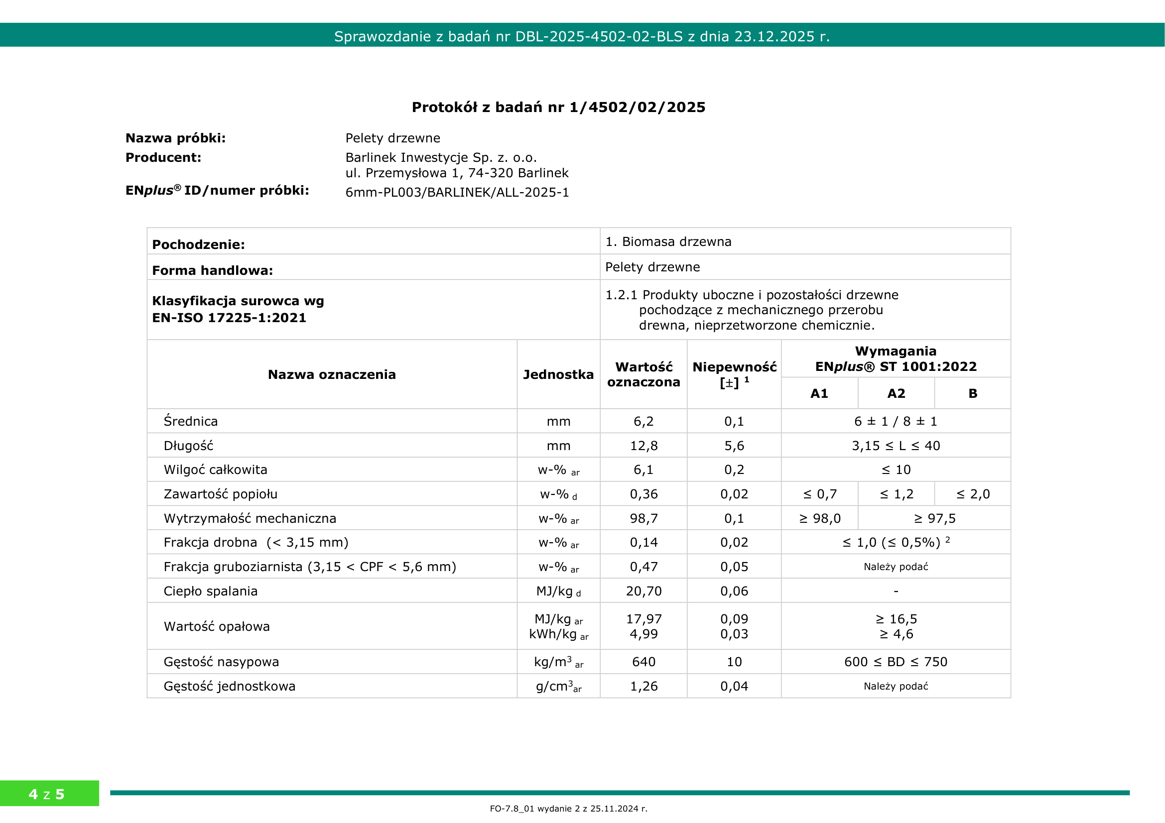 • wytrzymałość mechaniczna – 98,7 % (twardość, min.98% w ENplus A1)