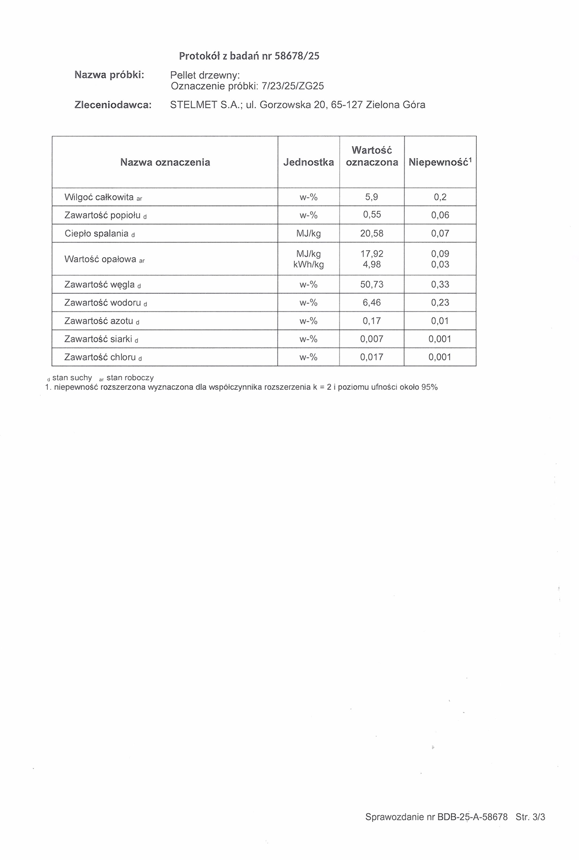 - wartość opałowa robocza (Ar) – 17,92 MJ/kg – tj. 4,98 kWh (wg normy wartość większa lub równa od 4,6 kWh/kg)